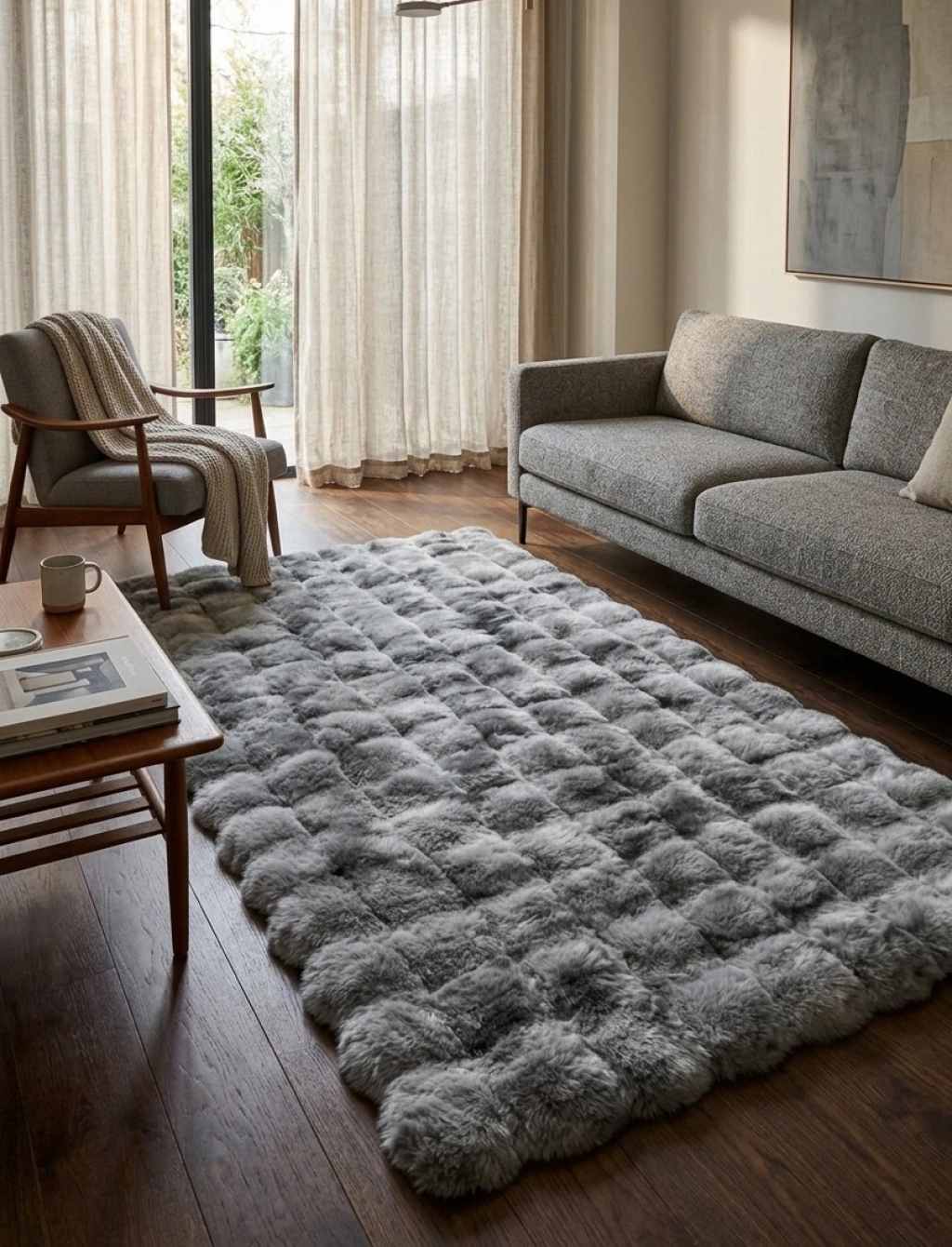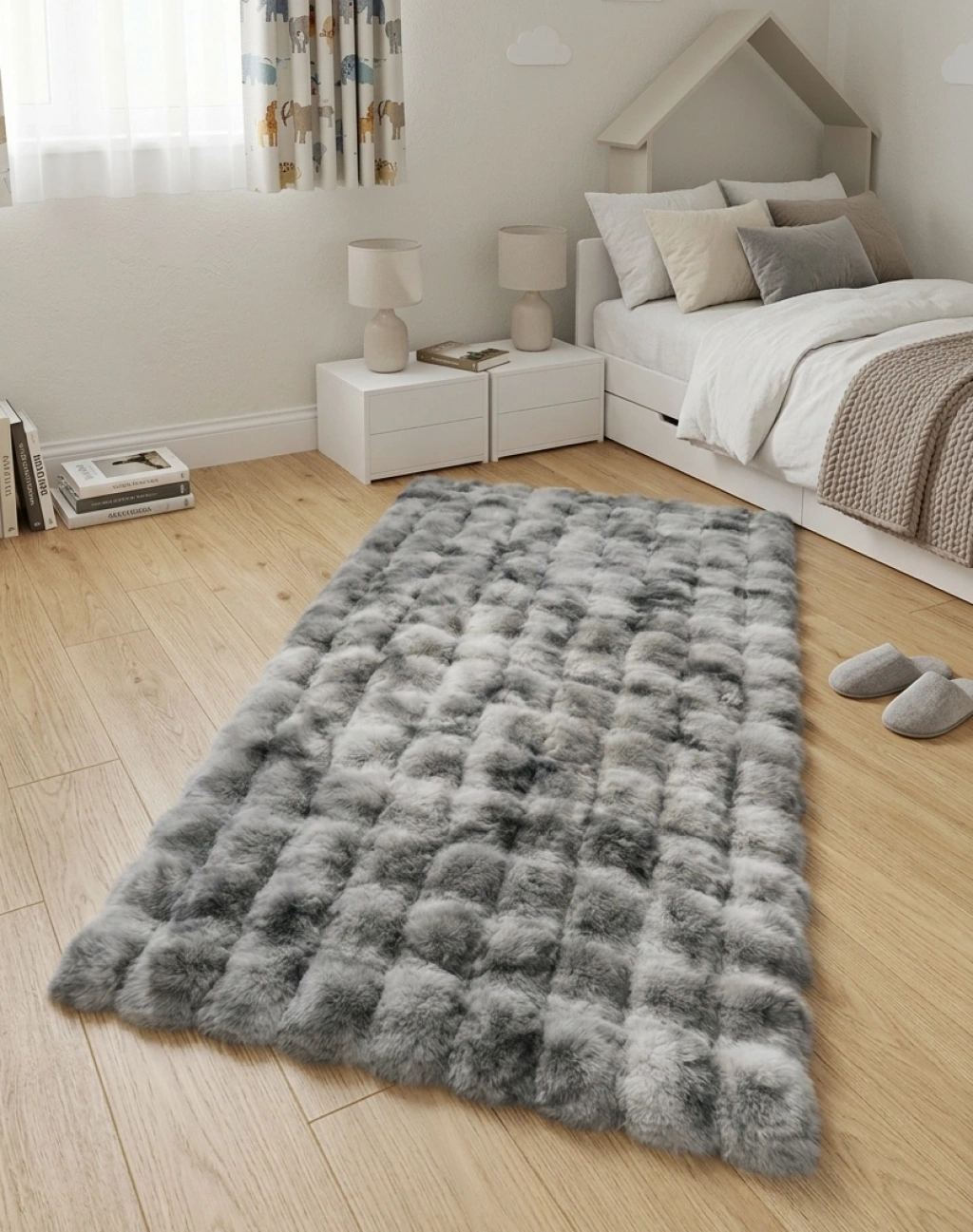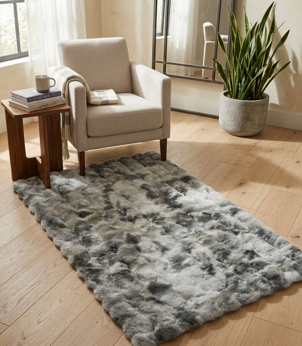 Suni tavşan tüyü halı: Üstün kaliteli suni tavşan tüyü, süper yumuşak ve ipeksi bir dokunuş sağlar. Kabarık ve tüylü halımızla yatak odanızı veya oturma odanızı rahat konforlu alanlar yaratın. Havalı 3 boyutlu baloncuk şekli, kar topu gibi hafif Sade ama monoton değil, sıcak ve rahat bir atmosfer yaratmak kolay.